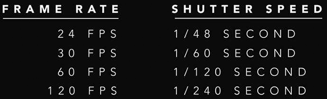 50 fps x 2 = 100 ➔ shutter = 1/100.