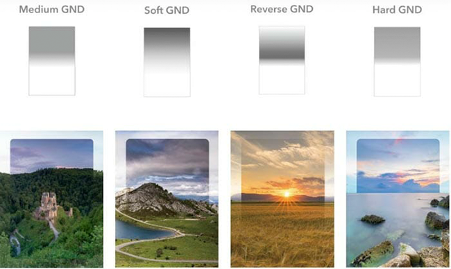 Infine i filtri GND si dividono in "Hard", "Soft", “Medium” e “Reverse” a seconda della morbidezza e della gradualità della sfumatura.