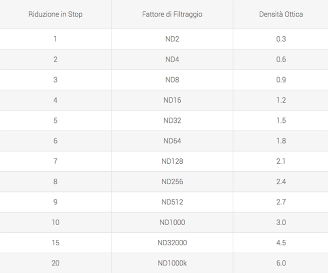 Fino a ND8: si tratta di filtri adatti a situazioni di luce scarsa. Gli ND64 sono perfetti per situazioni di luce intermedia. ND1000 ideali invece per situazioni di luce molto forte.