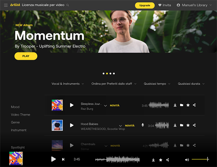 Ecco perché ti consiglio vivamente di utilizzare un servizio professionale come Artlist che ti semplifichi la ricerca della musica e ti alleggerisca la fase di montaggio.